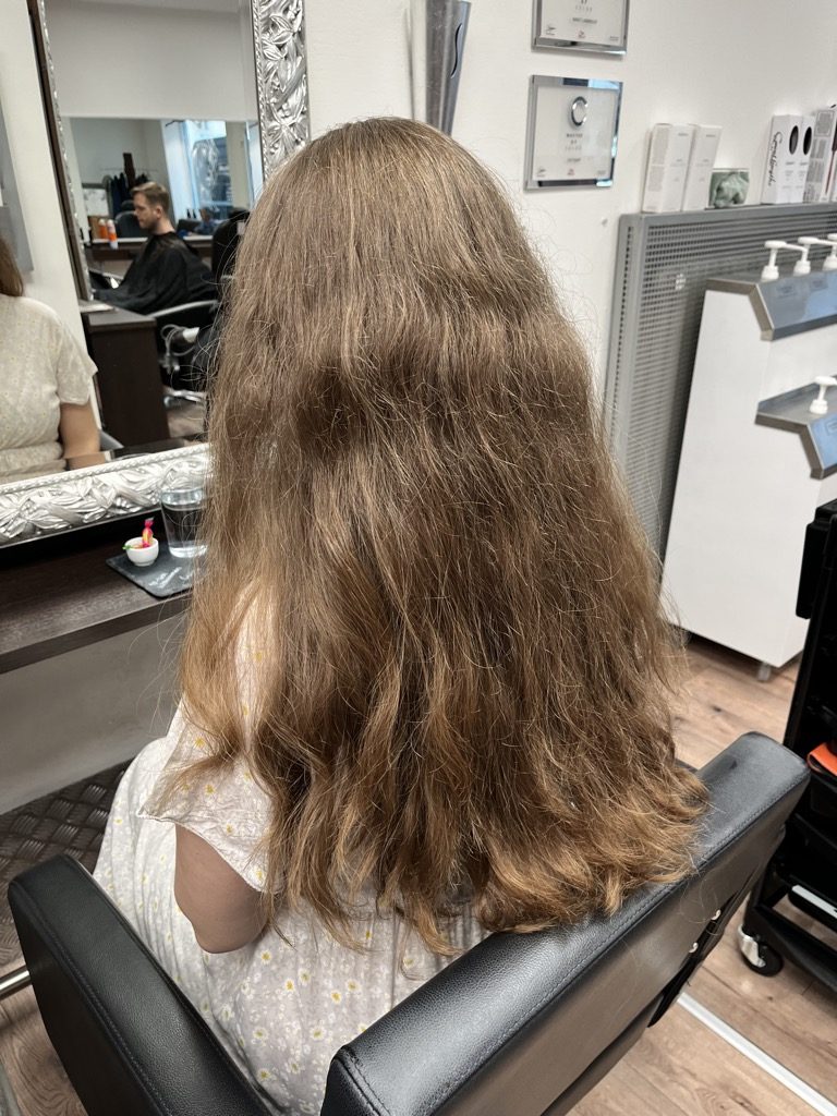 Der erste Haarschnitt erfolgt im trockenen Zustand – als präziser Drycut. Warum? Nur so sehen wir exakt, wie deine Locken natürlicherweise fallen.